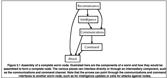 - Reconnaissance Component hunts down other network nodes to infect. This component is responsible for identifying the host on network that is capable of being compromised by the worm’s known methods.