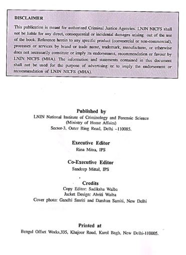 This comprehensive book, which comprises of 721 A4 size pages, gives relevant sections of law, crime statistics, crime scene management, crime scene kit, search procedure, potential evidence, preservation, packaging, transportation to laboratory, sample queries for laboratories, Do’s & Don’ts, precautions, case studies, photographs and references for each type of crime.