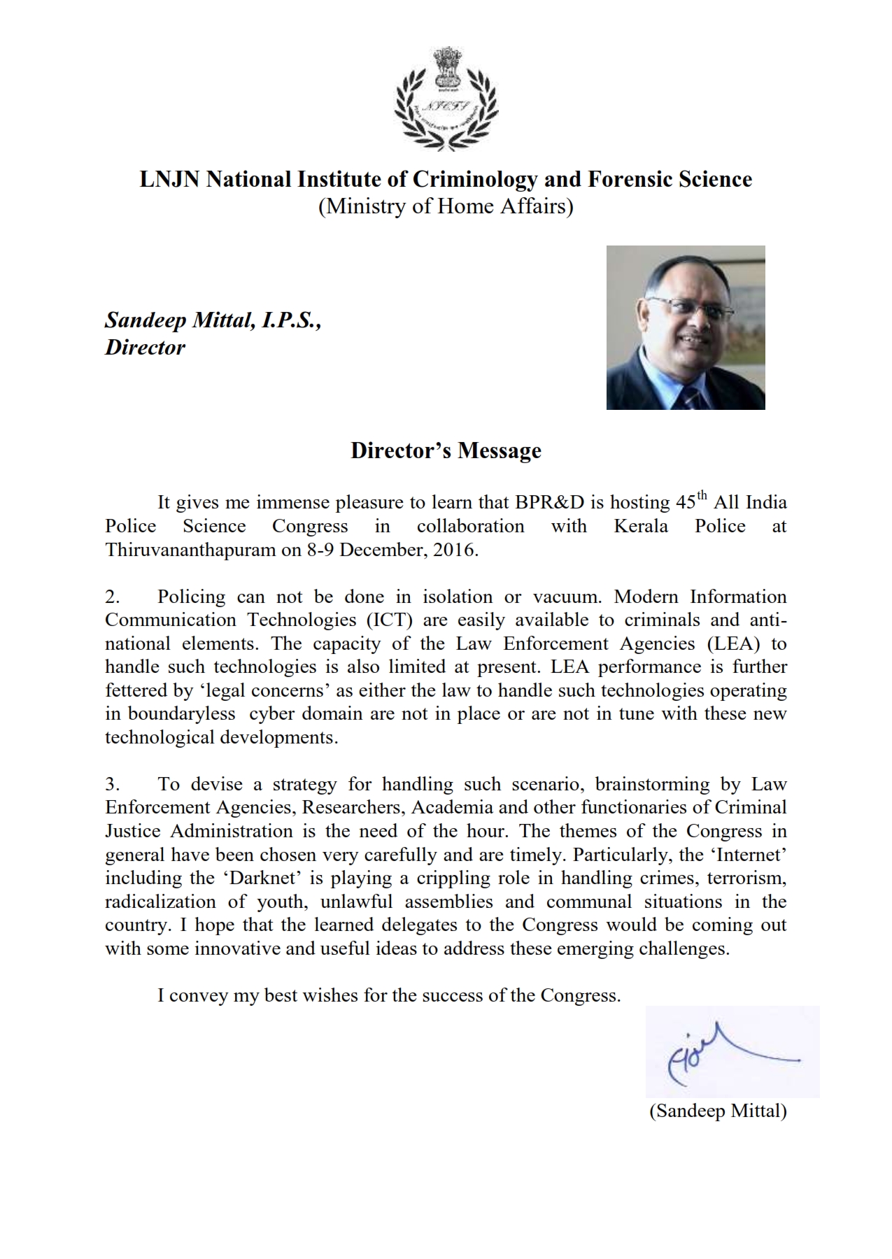 Bureau of Police Research and Development (BPR&D) and Kerala Police jointly organized the 45th All India Police Science Congress at Kovalam, Thiruvananthapuram on December 8-9, 2016. Sh. Sandeep Mittal IPS, gave the Director’s message for the Compendium of the 45th All India Police Science Congress.
